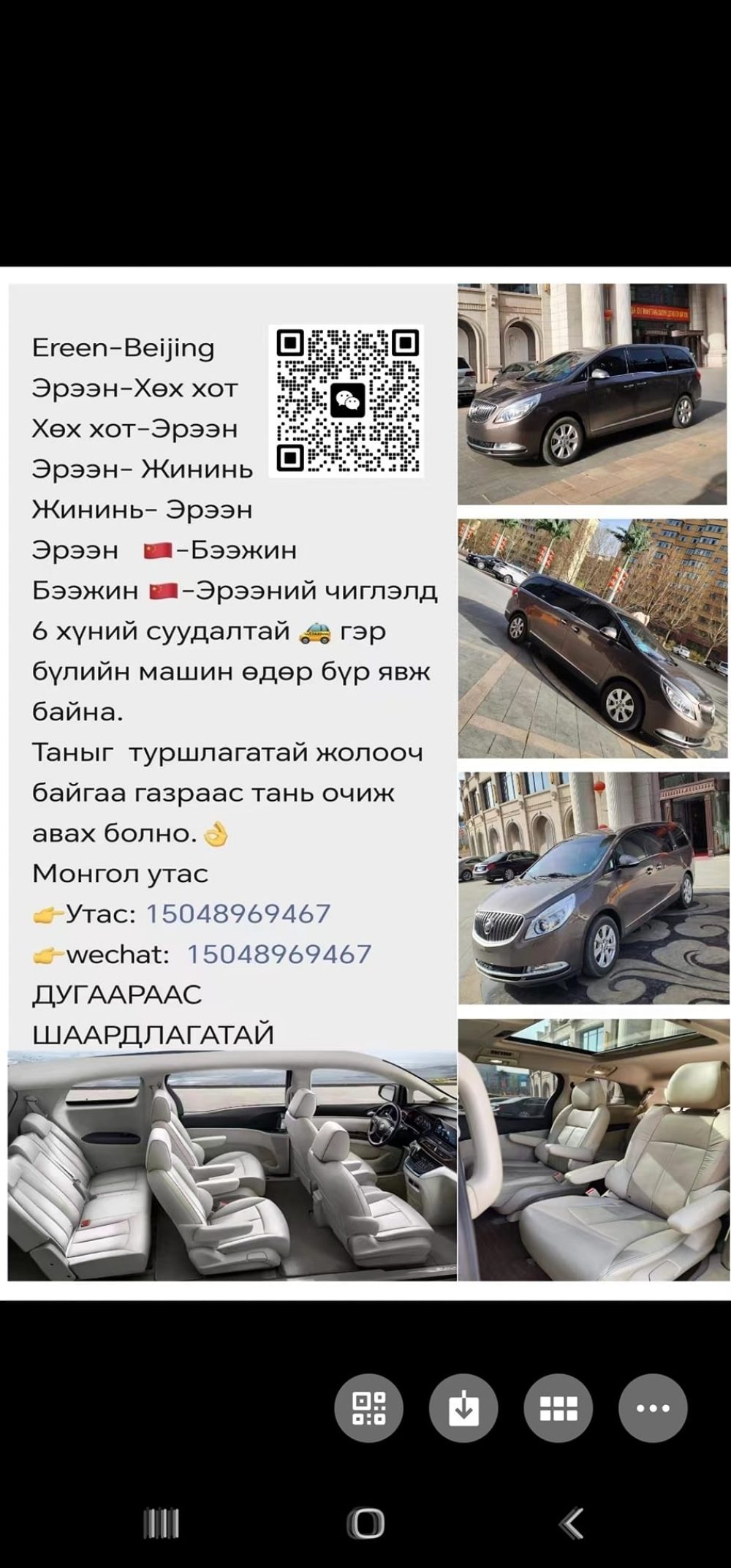 Бээжин -Эрээний чиглэлд 6 хүний суудалтай гэр бүлийн машин өдөр бүр явж байна. Машин тав тухтай. Суудал массаж хийгчтэй.